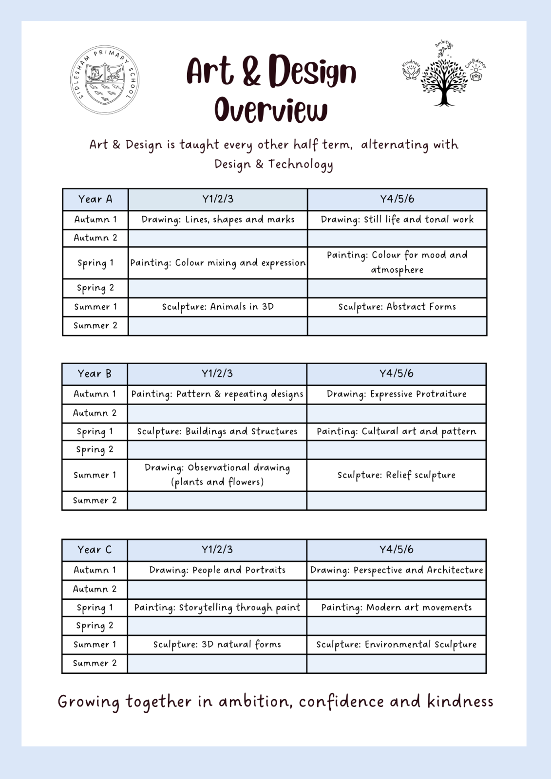 Art is taught in a structured and progressive way, with all children in Years 1 to 6 following a clear cycle of Drawing (Autumn), Painting (Spring), and Sculpture (Summer) each year. This ensures a balanced and engaging curriculum across all year groups.