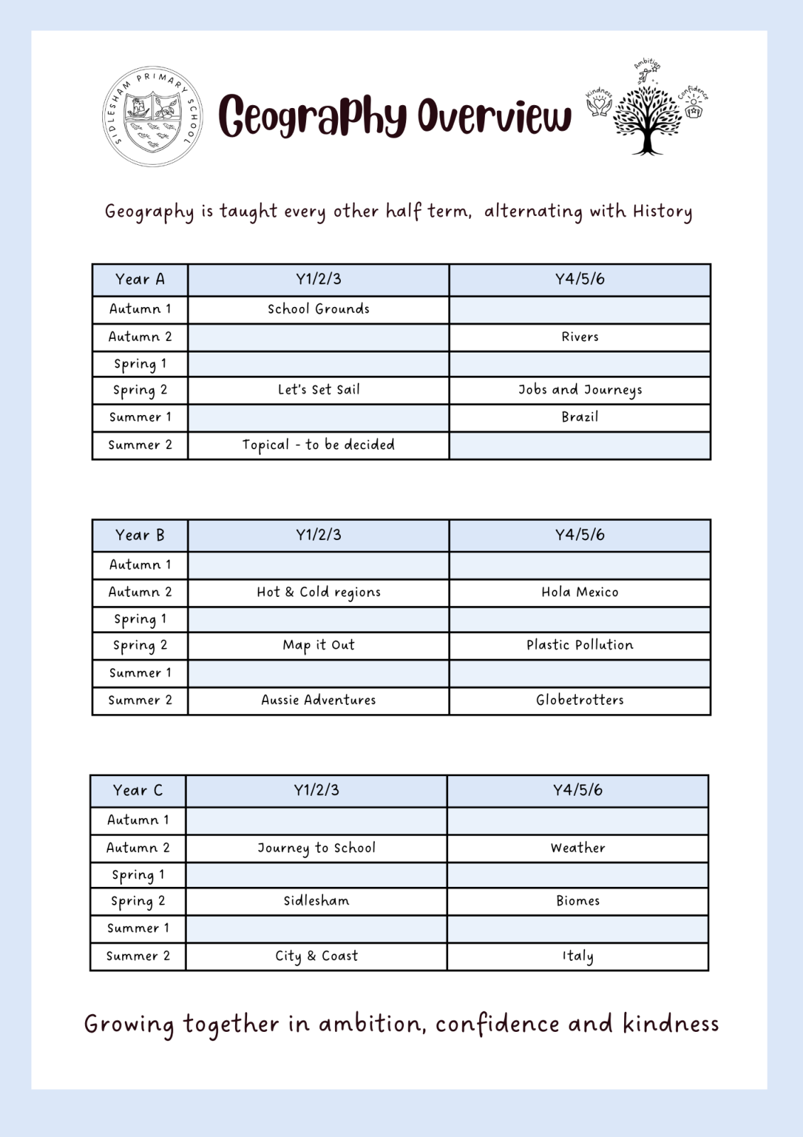 We follow the National Curriculum and teach geography over a rolling 3‑year cycle, so children in mixed‑age classes gradually build knowledge and skills.