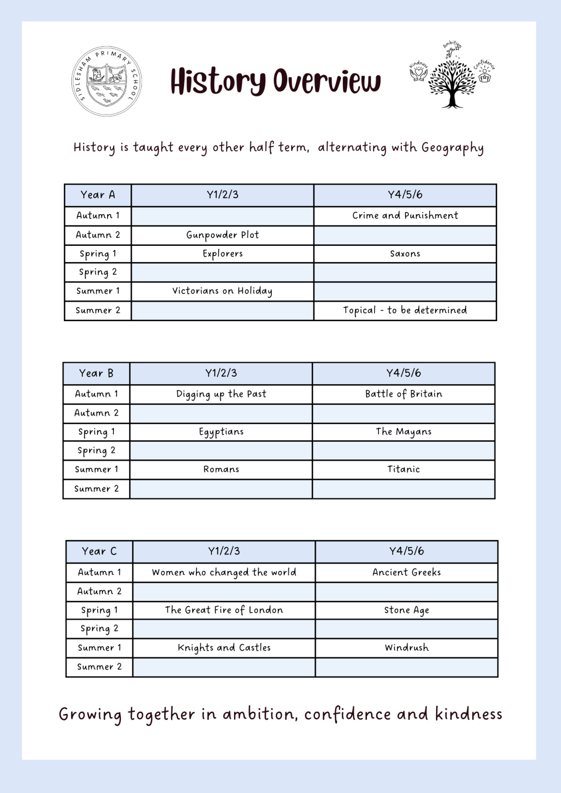 History is taught using a three‑year cycle so children in mixed-age classes revisit, build on, and deepen both substantial content and skills over time.