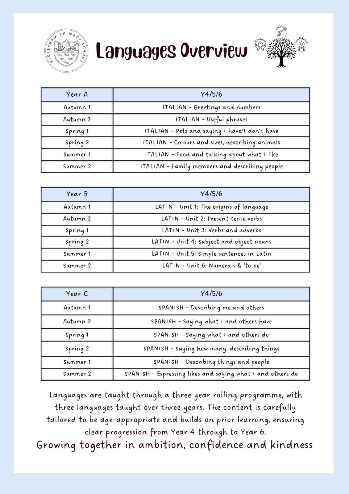 Languages are taught through a three-year rolling programme, ensuring all children in Years 4–6 experience Latin, Italian and Spanish before they leave Key Stage 2. Each cycle focuses on one language per year, with all pupils in Years 4–6 learning that language together—Cycle A: Italian, Cycle B: Latin, Cycle C: Spanish. This structure means that a child may begin a language for the first time in Year 6, so planning is carefully tailored to ensure progression is accessible and responsive to different starting points. Teaching is highly interactive and includes songs, rhymes, role-play, reading comprehension and structured writing. Key language skills—including grammar, pronunciation and vocabulary—are developed gradually, with a strong emphasis on phonics, sentence construction and communication. Progression is mapped clearly from Year 4 to Year 6 across all skill areas.