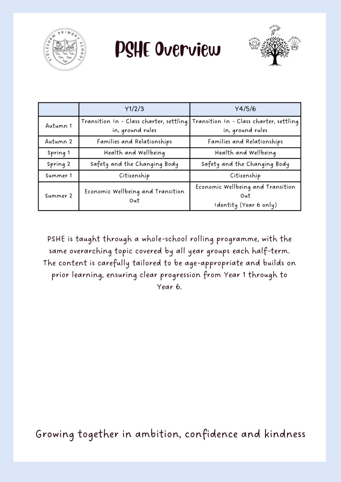 We aim to build both knowledge (about health, relationships, rights, responsibilities, safety) and skills (such as resilience, decision‑making, collaboration, self‑reflection) so children can navigate life with kindness, respect, and integrity. We believe PSHE underpins pupils’ emotional and social development as well as their readiness to be active citizens in their community.